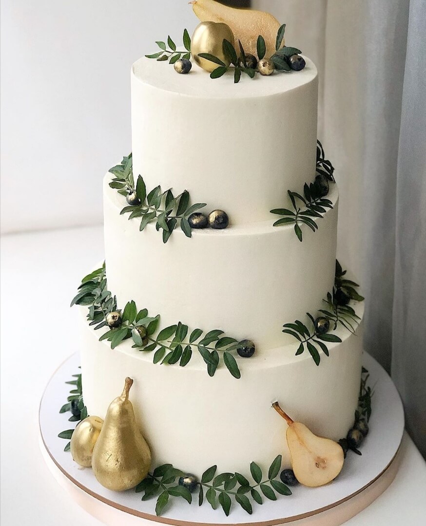Минималистичный торт в стиле рустик, скромно украшенный зелеными листьями и золотыми грушами